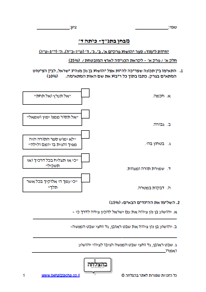 מבחן בתנ"ך לכיתה ד - ספר יהושע, פרק א, פרק ב, פרק ג, פרק ד, פרק ה, מבחן 2